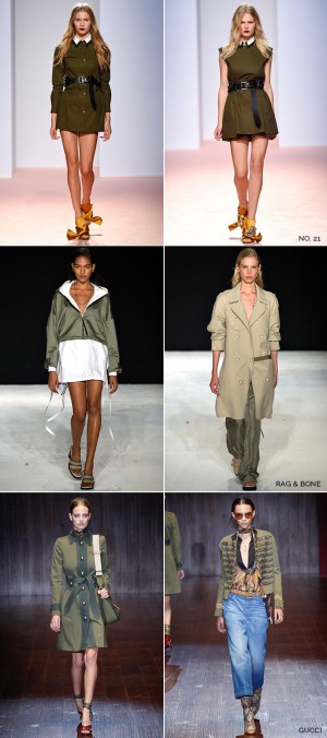 A gradient of military green has been marching down the fashion week runway. From Rag & Bone’s utilitarian parkas to Marc Jacob’s desert fatigues to Jason Wu’s abstract and modern take on camouflage to Gucci’s brigade inspired jackets and…