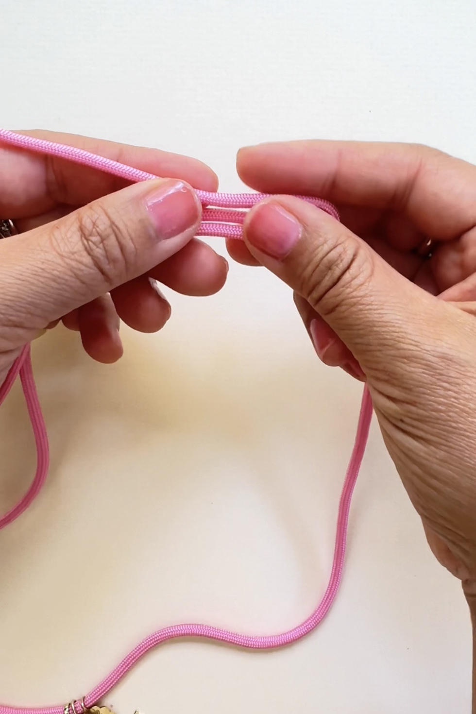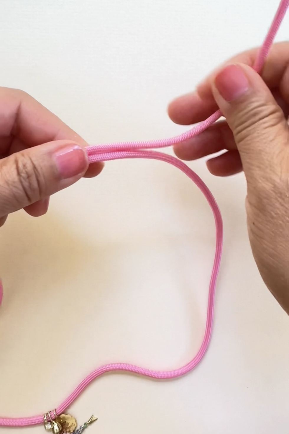 Flip the necklace around so the loose rope is now on top. Repeat the same step as before. Fold 3" of the left rope (top) back onto itself. Fold the last 2" of the tail over the overlapping ropes.