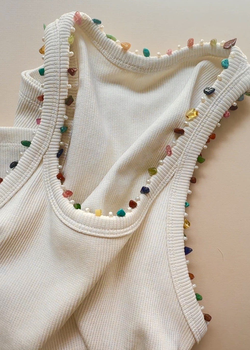 There’s something about summer that makes you want to reinvent the simplest things - jeans turn to cutoffs, layers get lighter, and even your most basic tank starts to feel like a blank canvas. Enter: gemstone chips. Not as you know them, but reimagined, stitched into soft cotton and catching the light with every movement.