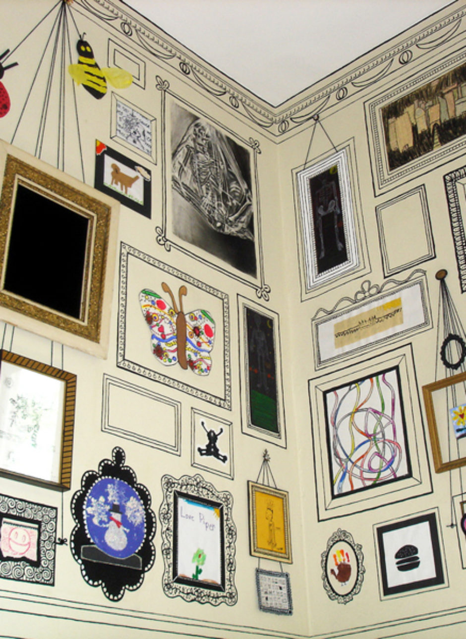 Or should I say off the chain?! These walls, covered in hand drawn frames and moldings, are WTF incredible. The artist hung some of her children’s art, painted the frames with black craft paint, and used…
